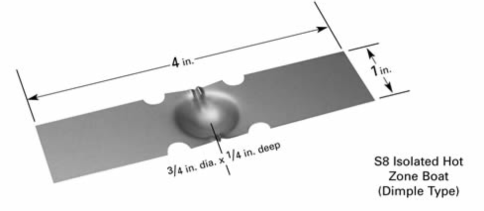 Boat Sources model S8D in W, Ta and Mo. Volume: 0.9cc