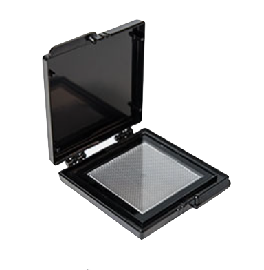 The 4" (101.60 x 101.60 x 11.68mm) box slides into a clip (GP-CLIP-44C) for secure closure and transport and has as usable are of 76.2 x 76.2mm.